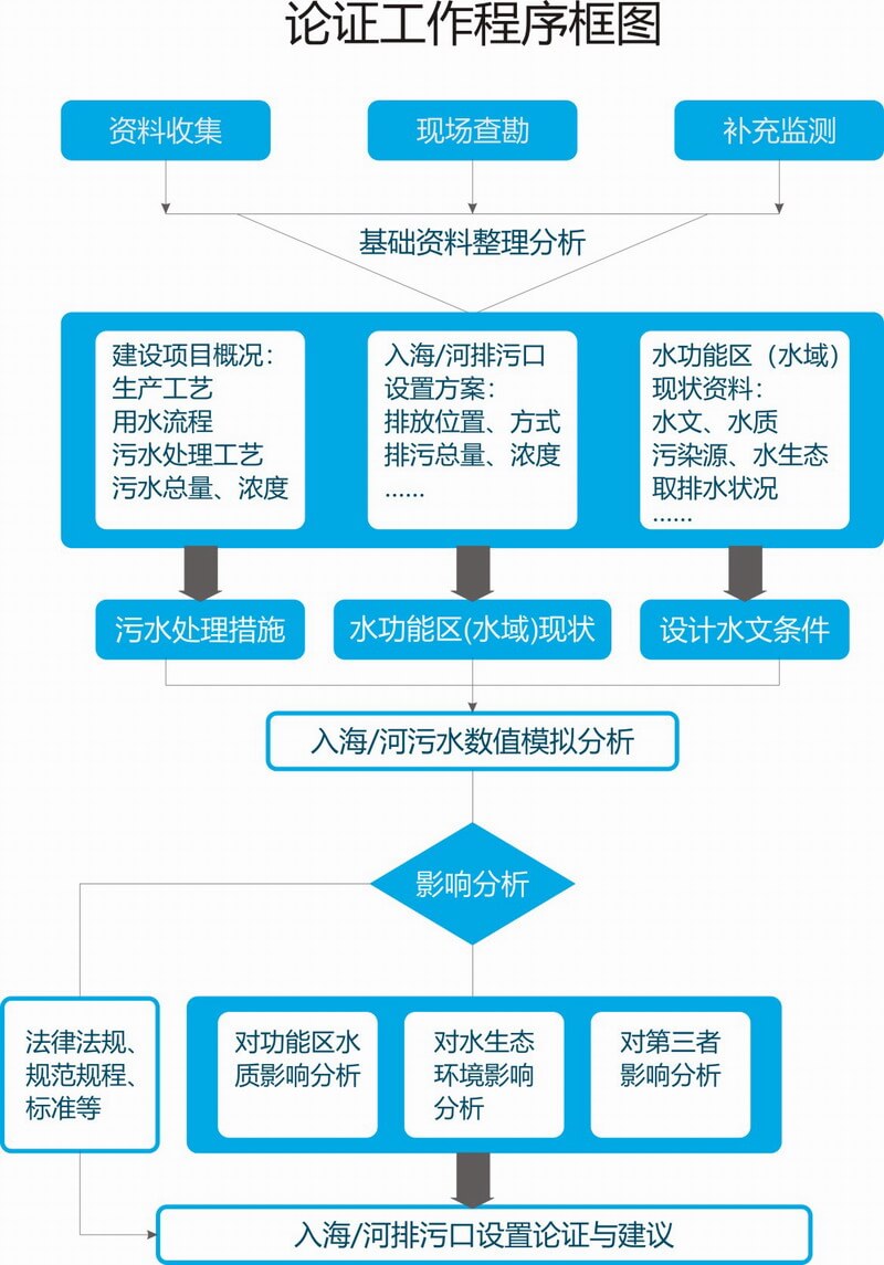 工作程序:入海/河排污口設(shè)置論證工作程序應(yīng)包括資料收集、現(xiàn)場查勘、補充監(jiān)測、設(shè)置可行性和合理性分析、設(shè)置影響分析、事故風(fēng)險評價以及提出水資源保護措施和結(jié)論建議等。